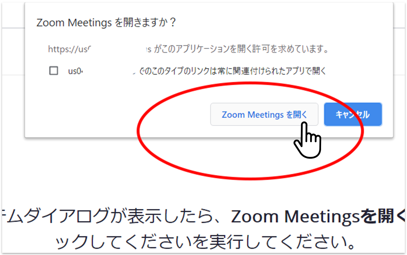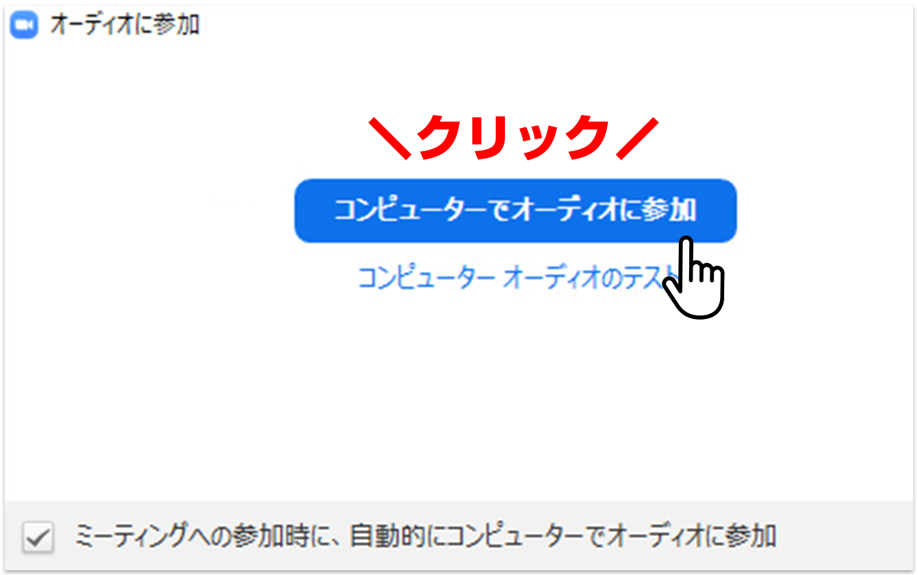 このとき、左下の「ミーティングへの参加時に、自動的にコンピューターでオーディオに参加」にチェックを付けておくと、次回から、このウィンドーは表示されなくなります。