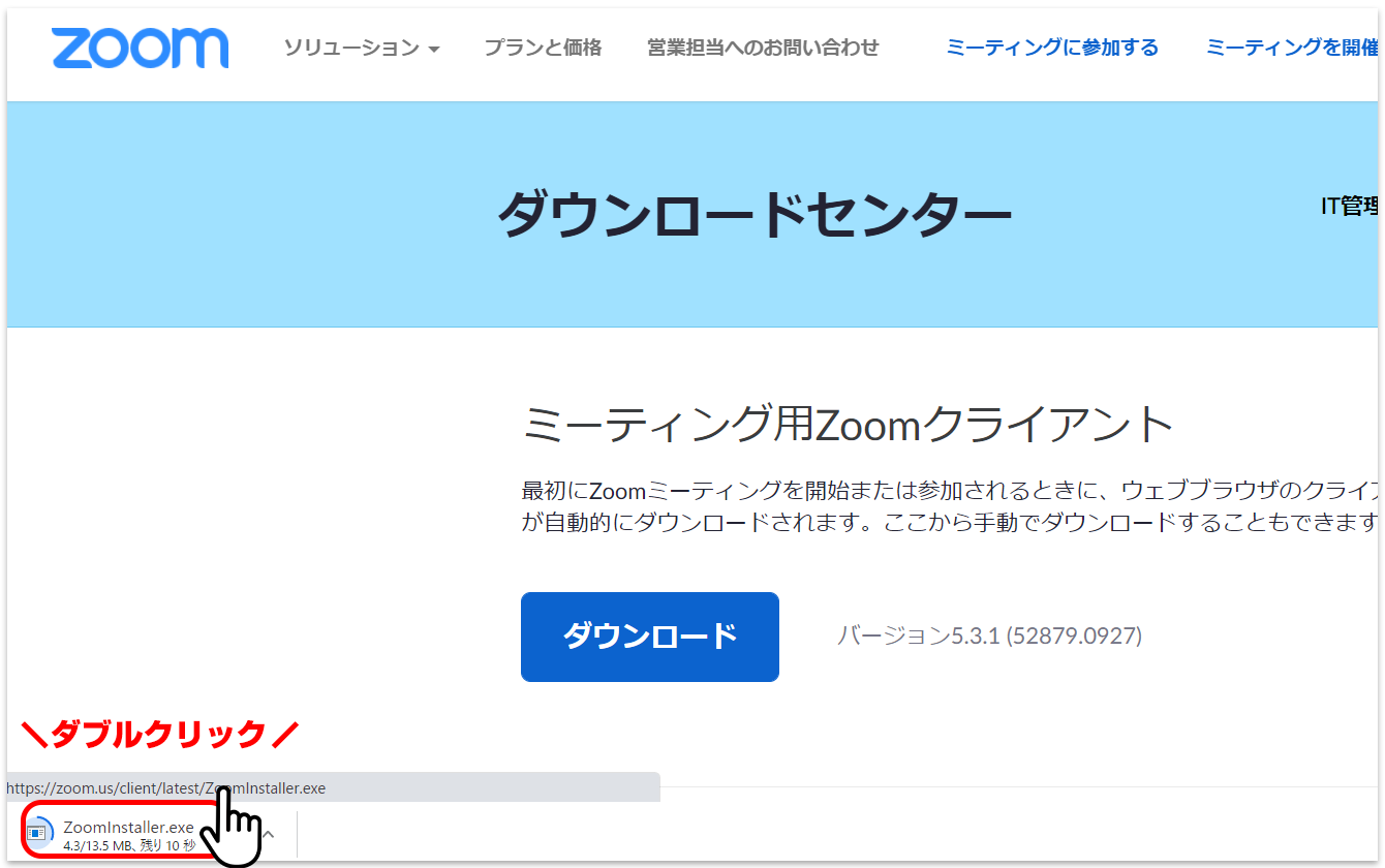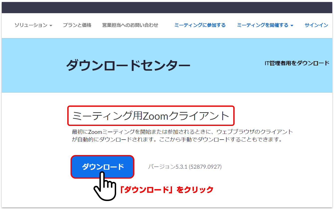 表示された画面の「ミーティング用」Zoomクライアントの「ダウンロード」をクリック