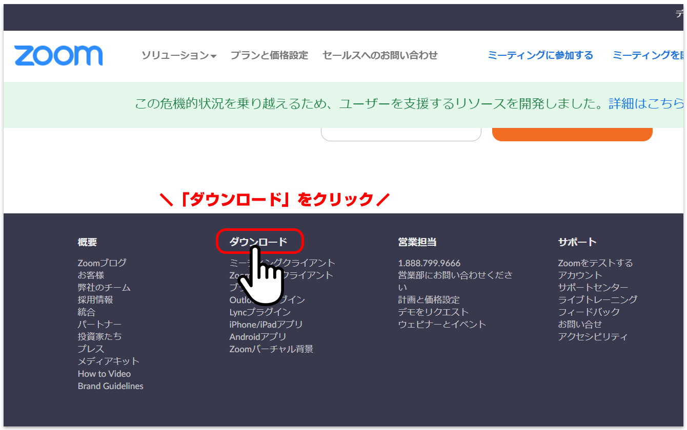 ZoomのWebサイト最下部にある『ダウンロード』をクリック